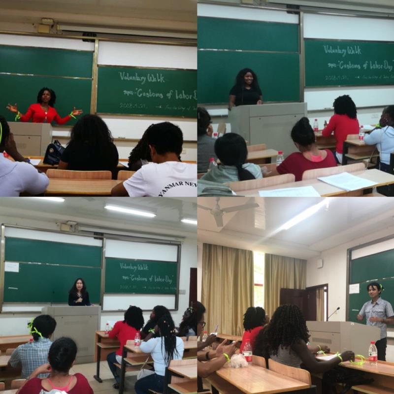 活动体验结束后,留学生志愿者们来到教室,对于各国劳动节风俗进行了热烈的主题讨论,每位志愿者踊跃发言,声情并茂的讲述关于自己国家的劳动节趣事,并回忆自己与家人在劳动节假期相处的温馨时光。
