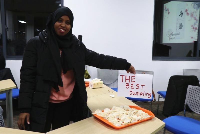 活动开始前,先为大家放映了“包饺子教学视频”,并将到场的留学生们分为4个小组,进行包饺子比赛,在10分钟内包好的饺子数量最多的一组同学将会获得奖励。