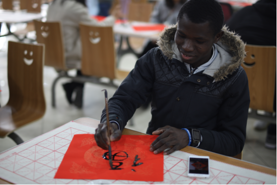 中国学生还教留学生们写书法。