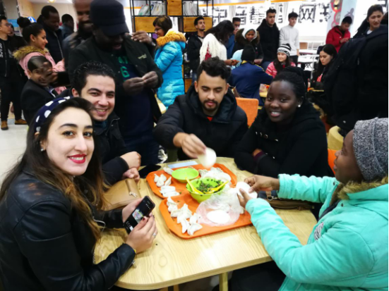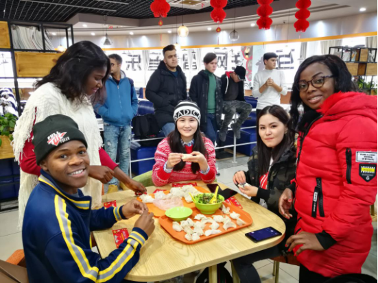 留校学生们一起学习包饺子,一个个形态各异的饺子包含着浓浓的中国年味。