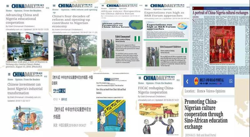 他把在中国的所见、所闻、所感写成专栏文章,向非洲人民全面介绍中国在政治、经济、文化方面取得的巨大成就。目前,他已经发表了10余篇文章,其中在《中国日报》上发表了7篇,还有1篇有幸被中华人民共和国国务院新闻办公室官网转载。