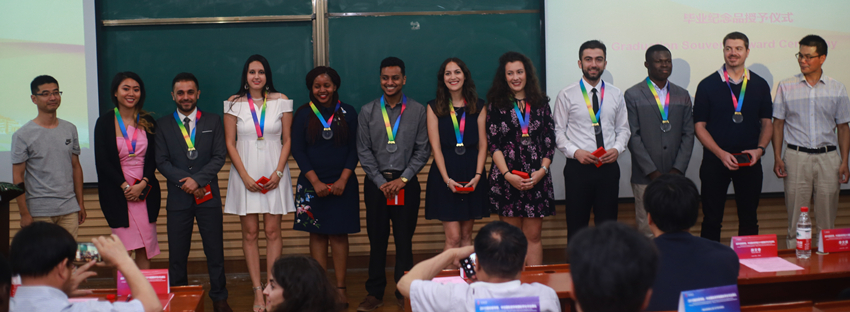 随后,在欢快的音乐声中,段文奇副院长与MBA中心主任郑小勇老师为2019届毕业国际学生授予毕业纪念奖牌。