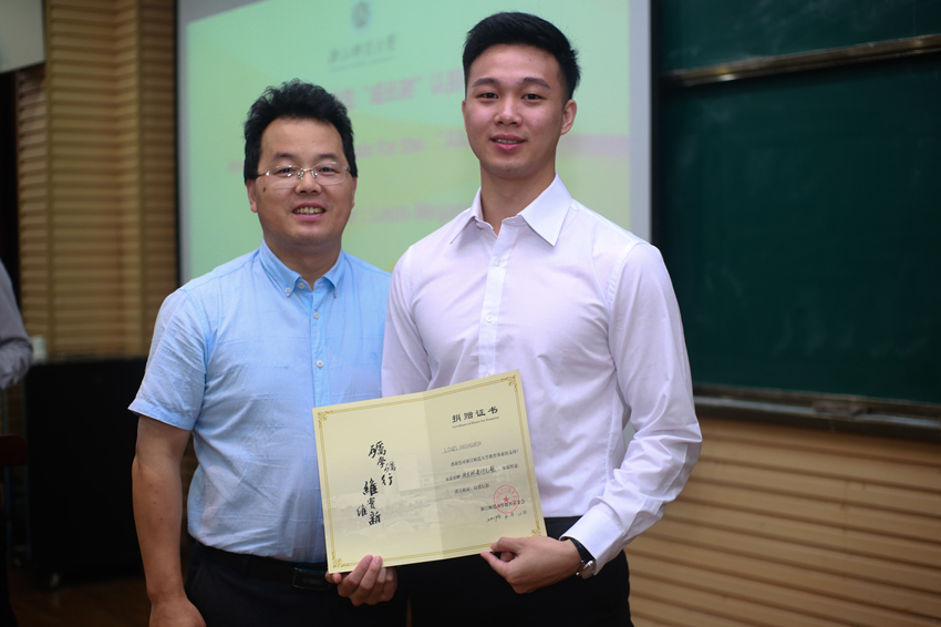 何曙荣副院长为2019届毕业生“成长树”认捐者LOUIS MEGASURYA颁发证书,LOUIS MEGASURYA 是学校首位以个人名义捐赠“成长树”的国际学生。