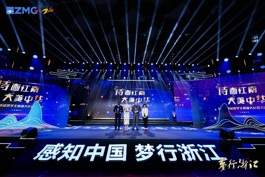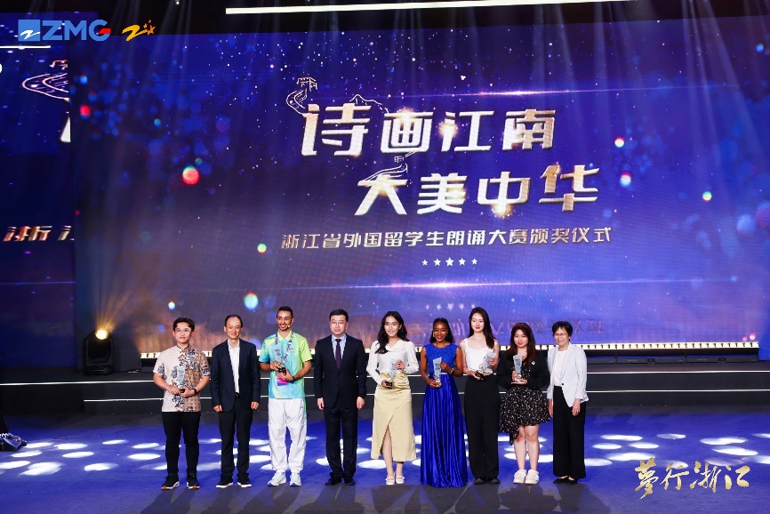 现场还举行了“诗画江南 大美中华”外国留学生朗诵大赛颁奖仪式。国际学生们通过诵读中华经典作品,以诗词为载体,用真情感受大美浙江,用行动感知中国文化,向世界展现中华传统文化之美。我校国际学生白小龙和欧静雅作为获奖学生代表上台领奖。
