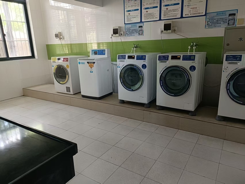 Shared facilities include a modern kitchen with a refrigerator, microwave, and induction cooker, as well as a public laundry room featuring an intelligent laundry system for easy use.